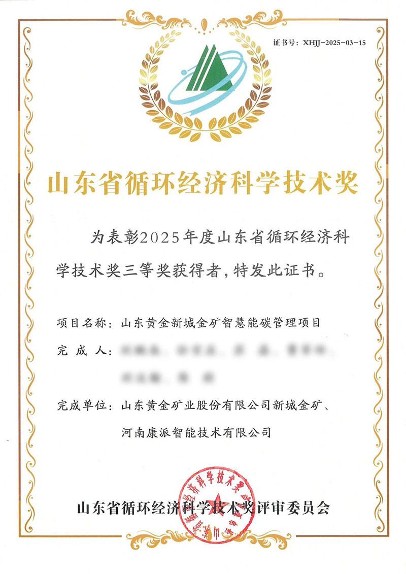 河南康派智能技术有限公司联合山东黄金矿业股份有限公司新城金矿共同打造的 “山东黄金新城金矿智慧能碳管理项目”,凭借其突出的技术创新实力与显著的绿色实践成效,成功斩获山东省循环经济科学技术奖三等奖,用硬核实力诠释了科技赋能绿色发展的深刻内涵。